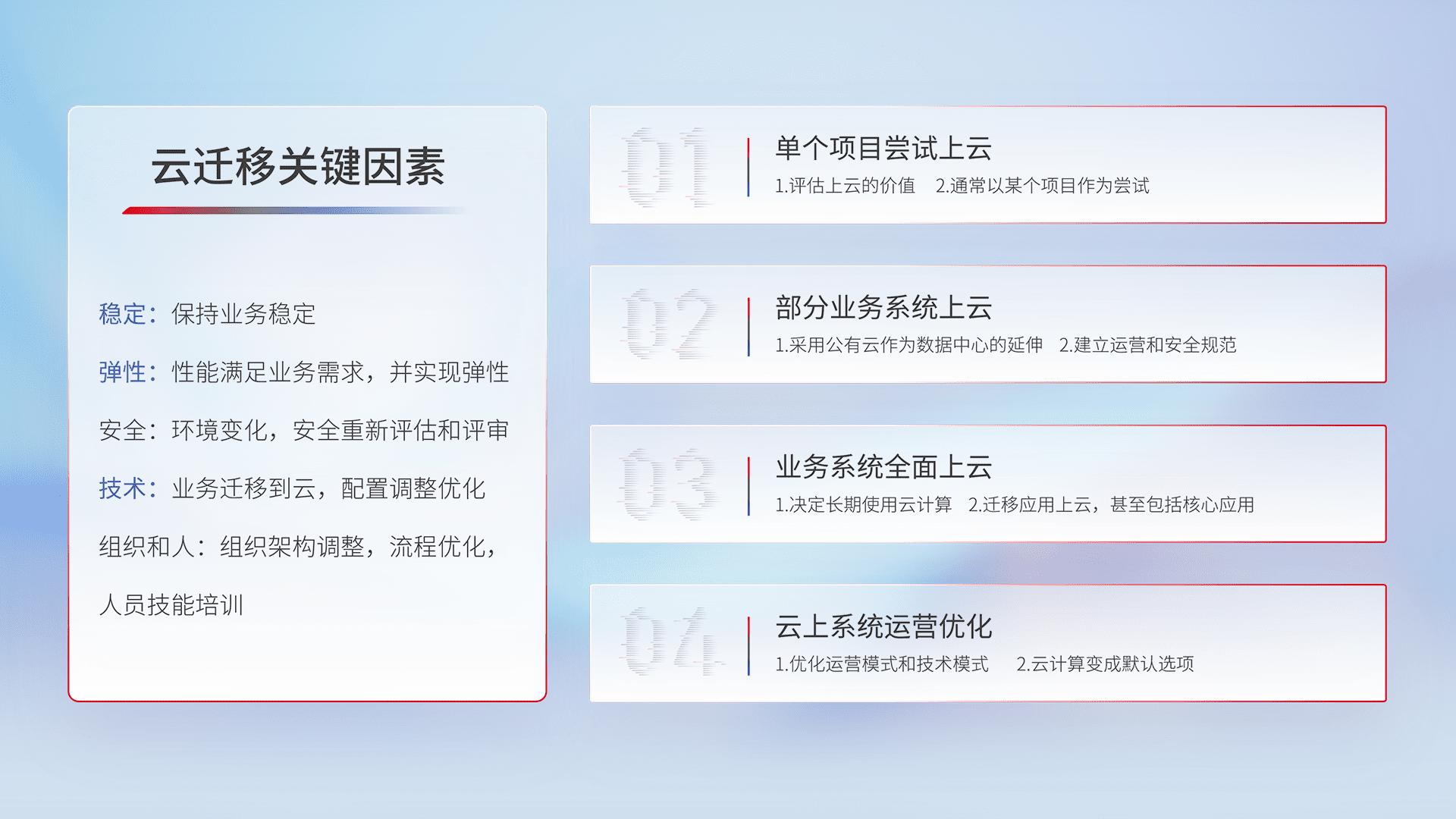 结合实际业务,,,从规划设计、、云平台选型、、、云原生改造、、、、数据迁移、、、集成交付,,,,迁移全过程为客户识别最佳上云路径,,做好风险识别管理,,,设计网络架构、、身份权限、、安全审计合规、、操作审计、、、日志审计、、、监控告警策略、、多站点容灾设计等,,,对云上基础设施进行整体规划,,,,提升IT治理水平,,以满足弹性、、、高可用、、高性能的需求。。。